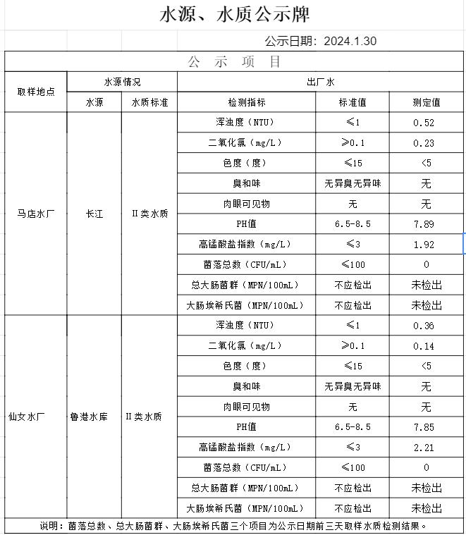 2024年1月30日水質(zhì)公告