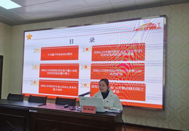 會(huì )上,國資宣講團成員許海旋同志用生動(dòng)案例、豐富史實(shí)、詳實(shí)數據,圍繞黨的十九屆六中全會(huì )精神,深刻解讀了百年歷程創(chuàng )造的偉大成就,帶來(lái)的重大改變,積累的“十條寶貴經(jīng)驗”等內容,詳細講述了國有企業(yè)從后勤保障發(fā)展到國之脊梁的改革發(fā)展之路,高站位、寬視野的報告,具有很強的針對性和感染力,是對深入領(lǐng)會(huì )、準確把握全會(huì )精神的有力指導。